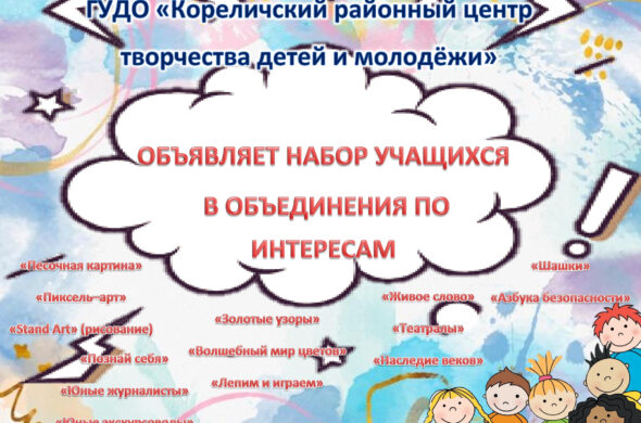 Дорогие друзья!!!Искренне рады приветствовать вас на страничках нашего сайта. В ГУДО «Кореличский районный центр творчества детей и молодёжи» создана особая атмосфера творческого поиска и комфортные условия для полной, интересной, активной жизни учащихся. Сплоченный коллектив педагогов, всецело отдающих свое сердце детям, строит свою работу таким образом, чтобы каждый воспитанник центра чувствовал себя комфортно и мог найти себе занятие по душе, будь то хореография, научно-исследовательская деятельность или декоративно-прикладное творчество.