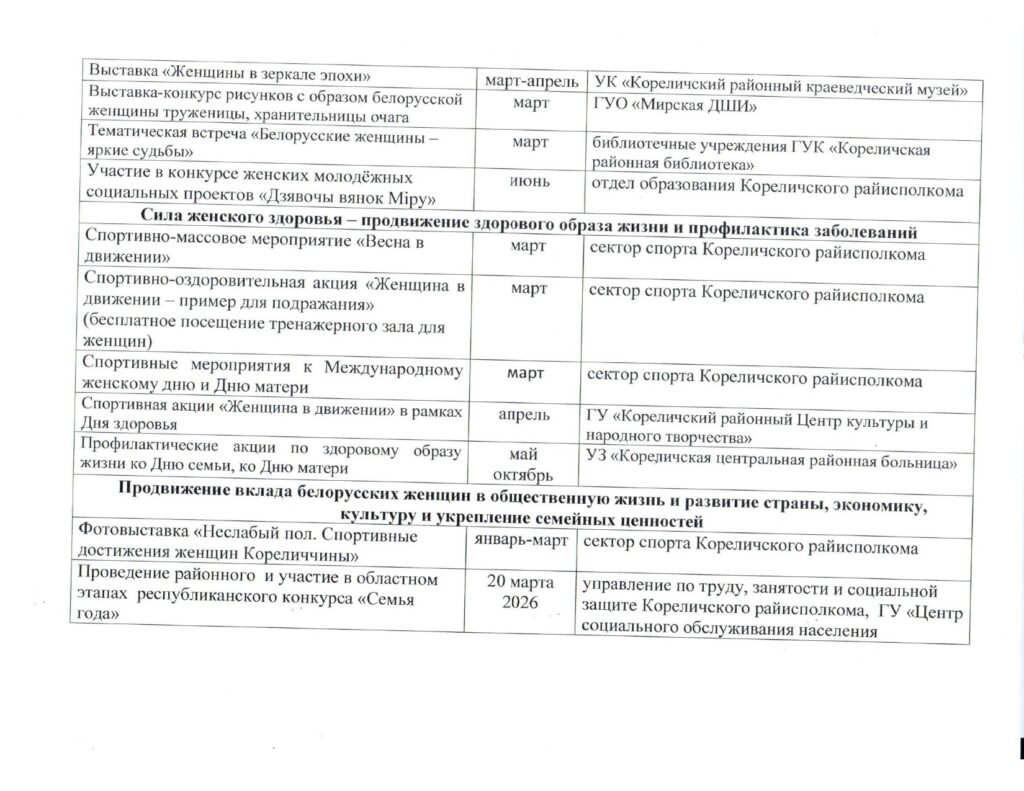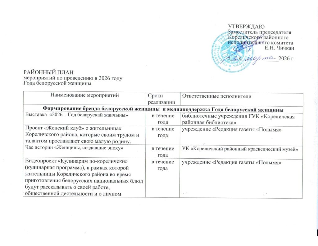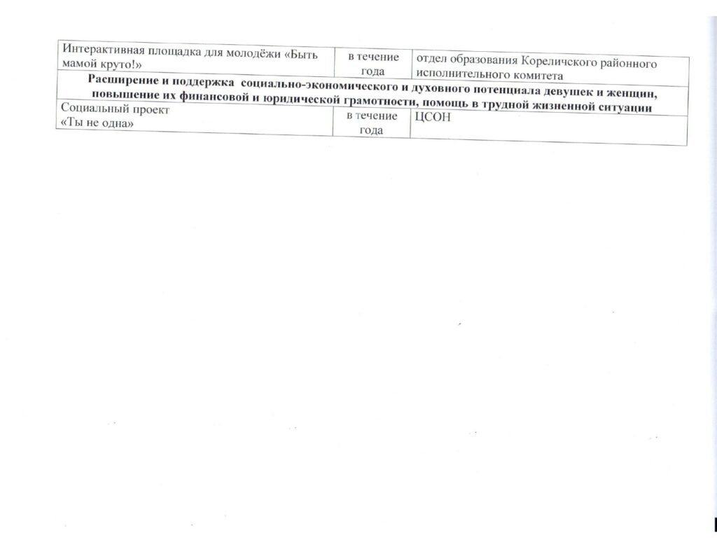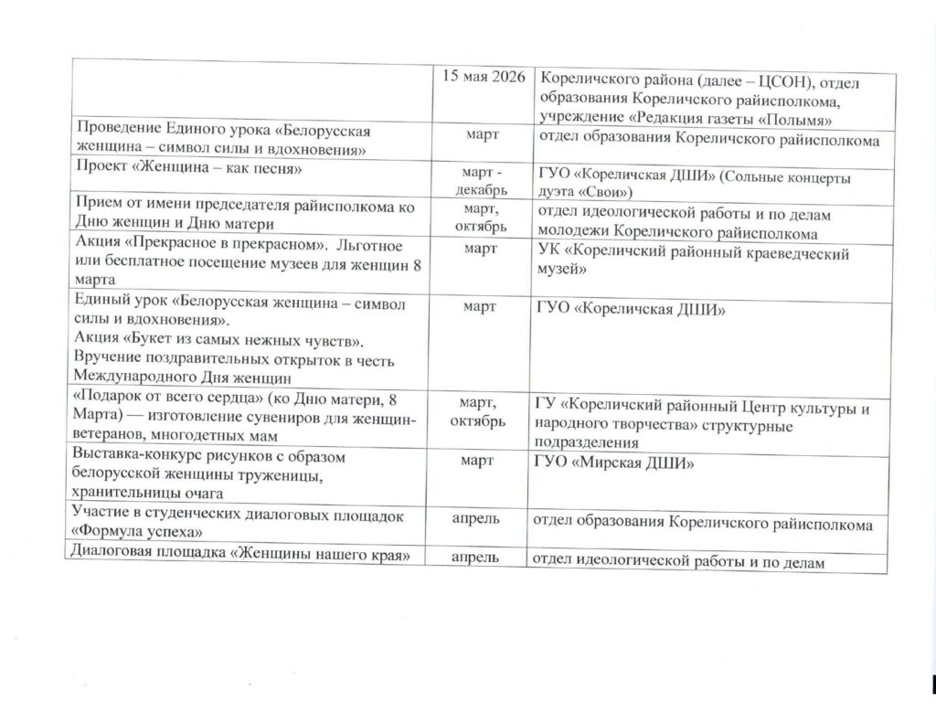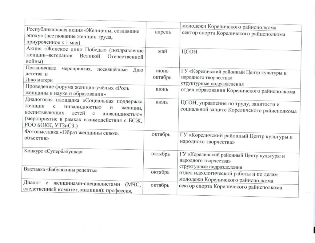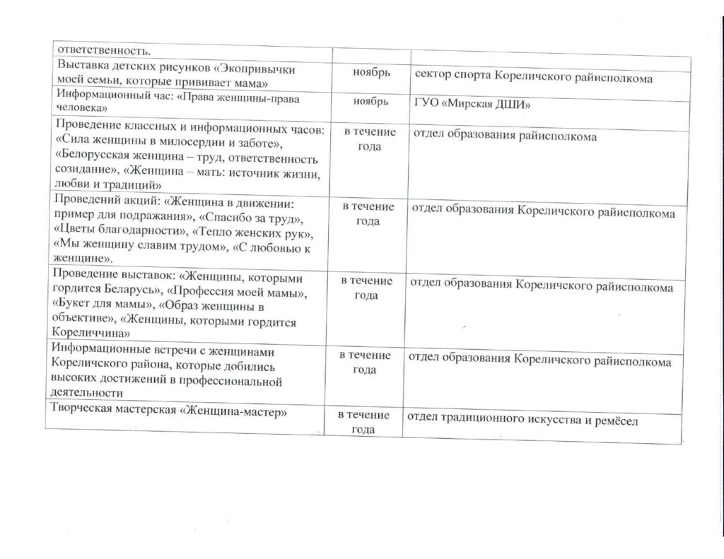 1.Разработка и размещение плана, логотипа на официальном сайте ГУДО «Кореличский районный центр творчества детей и молодежи» приуроченного к Году белорусской женщины.ЯнварьЗам.директора по УМР Бында Ю.С. Культорганизатор Лустач В.Ю.